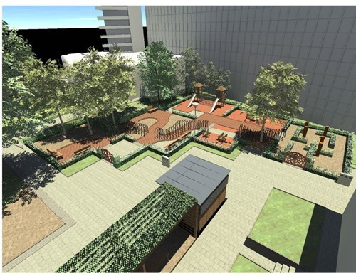 A játszóteret és labirintuskertet a város lakóinak, különösképpen a kerekesszékkel, gyerekkocsival közlekedők és az idős emberek igényeinek megfelelően tervezték meg a szakemberek.