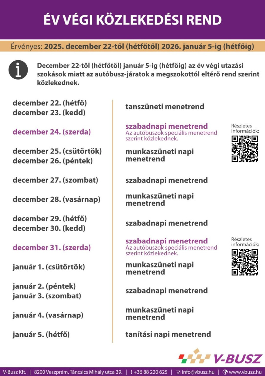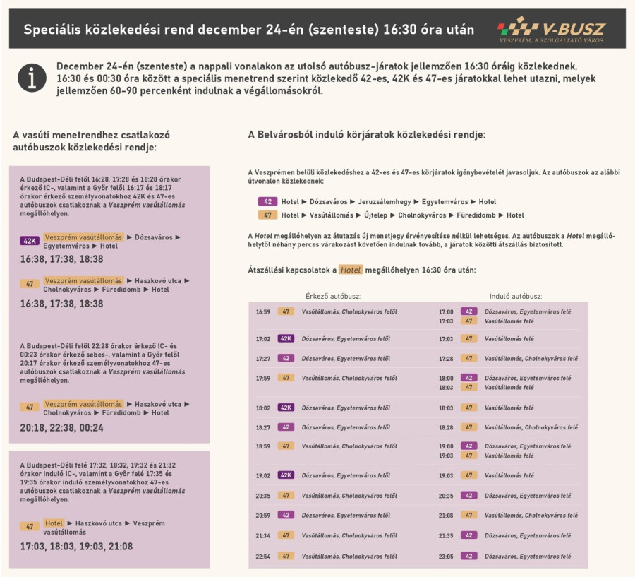 December 24-én, szerdán szabadnapi menetrend lesz érvényben, majd 16:30 órától a nappali járatok közlekedése szünetel másnap üzemkezdetig. 16:30 órát követően az éjszakai járatokat (42, 42K, 47) lehet igénybe venni, melyek a Budapest felől érkező gyorsvonatokhoz csatlakozva közlekednek az alábbiak szerint:
