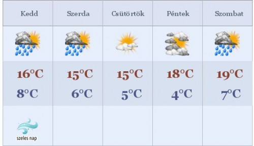 Kedden reggel kevesebb lesz a felhő, a keleti tájakon és délkeleten lehet kisebb eső, zápor. A nyugatias szél gyenge vagy mérsékelt lesz, foltokban sűrű köd képződhet. Hajnalban 6-11 °C-ig csökken a hőmérséklet. Napközben többórás napsütés várható, a változóan felhős égből főleg a középső, esetleg a déli országrészben számíthatunk záporokra.