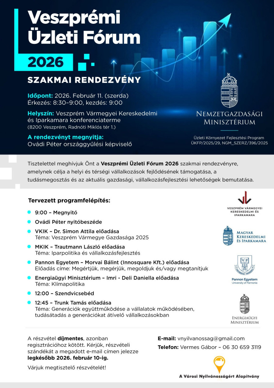Milyen lesz Veszprém vármegye gazdasági helyzete idén? Hogyan oldható meg a generációk közötti együttműködés egy cégen belül? Milyen iparpolitikai irányok várhatók? Ezekre a kérdésekre kaphatnak választ azok, akik részt vesznek jövő hét szerdán a Veszprémi Üzleti Fórum 2026 szakmai napon.