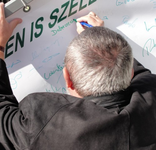 – Nem csak a szemétgyűjtésben kell jeleskedni, hanem az újrahasznosításban is – oktatta a kicsiket, nagyobbakat a polgármester, majd elmondta, hogy Veszprém jó ebben, hiszen nemrég kapta meg a Biodiverzitás-díj második helyét. Végül aláírta a kamion molinóját.