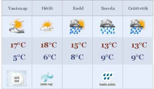 Vasárnap reggelre kelet felől fokozatosan csökken a felhőzet, a Dunántúlon viszont még sok felhő lesz az égen. Gyenge vagy mérséklet légmozgás valószínű, így helyenként -leginkább keleten, északkeleten- ismét párássá, ködössé válhat a levegő. Hajnalban 3-8 °C-ot mérhetünk, de a kevésbé felhős keleti tájakon hidegebb is lehet, akár gyenge talajmenti fagy sem kizárt.