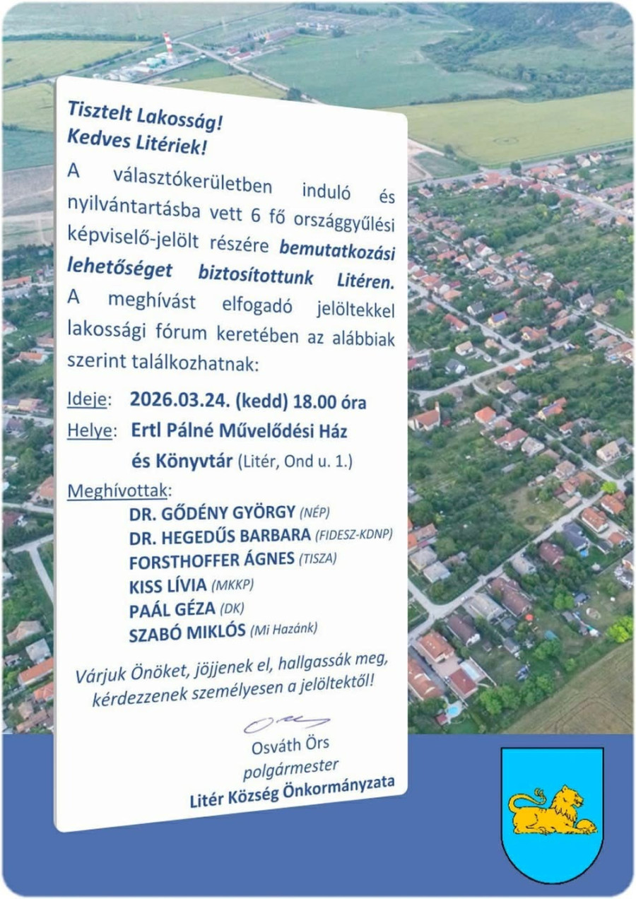 Osváth Örs, Litér polgármestere hivatalos meghívóban tájékoztatta a lakosságot, hogy a település önkormányzata nyilvános fórumot szervez a választókerületben induló országgyűlési képviselőjelöltek számára. A rendezvény célja, hogy a litériek első kézből, személyesen ismerhessék meg a politikusok programját és tehessék fel nekik kérdéseiket.