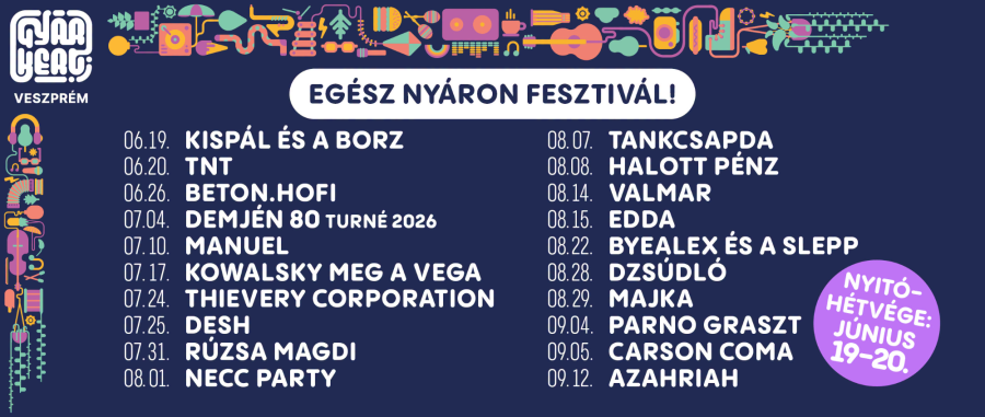Izgalommal és kreativitással újratöltve érkezik idén is a Gyárkert majális kultúra Izgalommal és kreativitással újratöltve érkezik idén is a Gyárkert majális A körhinta, a céllövölde, az ugrálóvár és persze a hideg italok és a finom ételek a majálisok elengedhetetlen elemei. A Gyárkert viszont nem áll meg ezeknél a klasszikus élményeknél! Május 1-én a hagyományos majális hangulatát még több kreatív és izgalmas programmal toldják meg. 2026. április 14. 15:52 A Thievery Corporation, Beton.Hofi és a Kispál és a Borz is koncertezik nyáron a Gyárkertben Gyárkert A Thievery Corporation, Beton.Hofi és a Kispál és a Borz is koncertezik nyáron a Gyárkertben 2026-ban negyedik alkalommal nyitja meg kapuit a veszprémi Gyárkert Kultúrpark, ami az elmúlt években az ország egyik legizgalmasabb szabadtéri kulturális helyszínévé vált. A június közepétől szeptember elejéig tartó programsorozat idén is a hazai könnyűzenei élet legnépszerűbb előadóit és legendáit hozza el a városba, miközben nemzetközi sztárok is színpadra lépnek a több mint ötezer fő befogadására alkalmas szabadtéri koncerthelyszínen. Az első bejelentett 10 név között többek között a Halott Pénz, Beton.Hofi és a Thievery Corporation is szerepel. 2026. március 12. 14:27 Idén is lesz Gyárkert! kultúra Idén is lesz Gyárkert! A hírt szombaton jelentette be Ovádi Péter parlamenti képviselő és Porga Gyula polgármester. 2026. március 7. 17:32