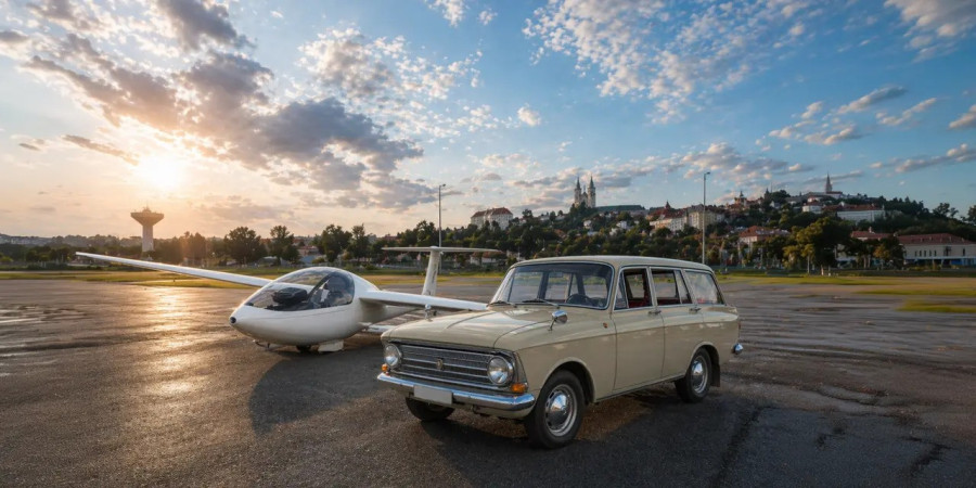 Vitorlázó repülőgép és veterán autó a parkolóban – beülhetsz, fotózkodhatsz