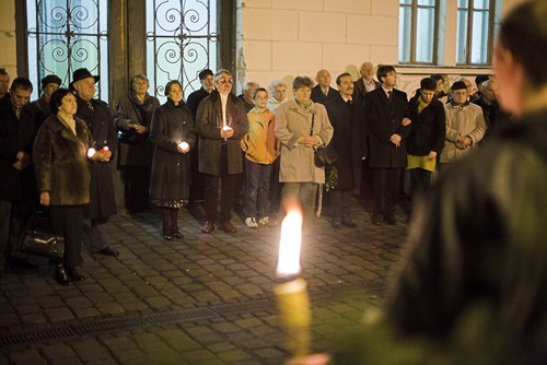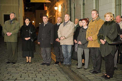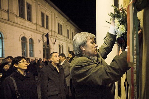 A szabadságharc veszprémi mártírjainak felsorolása után a jelenlévők elhelyezték Brusznyai Árpád emléktáblájánál mécseseiket, virágaikat, koszorúikat.