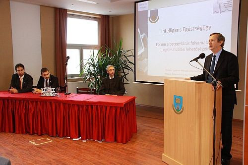A fórum lehetőséget biztosított a területen dolgozó szakemberek számára igényeik bemutatására. Dr. Kósa István, a Műszaki Informatikai Kar docense, a Veszprém Megyei Csolnoky Ferenc Kórház orvosa mutatta be az egészségügyi folyamatok múltját és jövőjét. Hangsúlyozta, hogy az egészségügy logisztikája is megújításra szorul, hiszen professzori szinten születik döntés, amit egy algoritmus is el tudna végezni. Az algoritmusok rendelkezésre állnak, a megoldás az infokommunikációban keresendő. Az intelligens egészségügyi rendszerek az egészségügyi szolgáltatások és intézmény-rendszer optimalizált működtetését lehetővé tevő olyan új generációs technológiai és szervezési megoldások, amelyek az orvosi és logisztikai folyamatok vezérléséhez szükséges információkat a legoptimálisabb helyen, időben, módon és gyakorisággal gyűjtik, elemzik és használják fel.