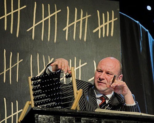Keresztes Gábor hiúja, főleg a második, pusztulást mutató felbukkanáskor erős, Háromszéki Péter földrajztudósa mondjuk megtanulhatná a szöveget, de Bakody József elesett lámpagyújtogatóját lehet sajnálni, berzenkedni a pénzt mániákusan számolgató, üzletembert hitelesen hozó Máté P. Gábortól, azonban az igazi telitalálat Szűcs László iszákosa. A díszlet – mintha egy Unikumos üvegen élne, amit körüllengenek az üres palackok, és a szövege (Mit csinálsz? Iszom. Miért iszol? Hogy felejtsek. Mit? Hogy iszom) sokkal karakteresebben rajzolódik, mint a könyvben, itt a dramaturg (Deres Péter) munkáját dicséri. Mint ahogy a világok széteséskor hallható párbeszédek, a Perjési Hilda játszotta okostojás virág rontott közmondásai, a szólásmondások összekutyulása eléri az általános iskolások ingerküszöbét is.