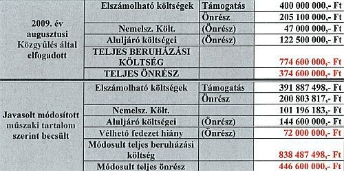 Látható, hogy 72 millió fedezethiány jelenik meg a módosított tartalom alapján. Ezt az összeget kellene az önkormányzat biztosítania a pályázat sikeres megvalósításához.